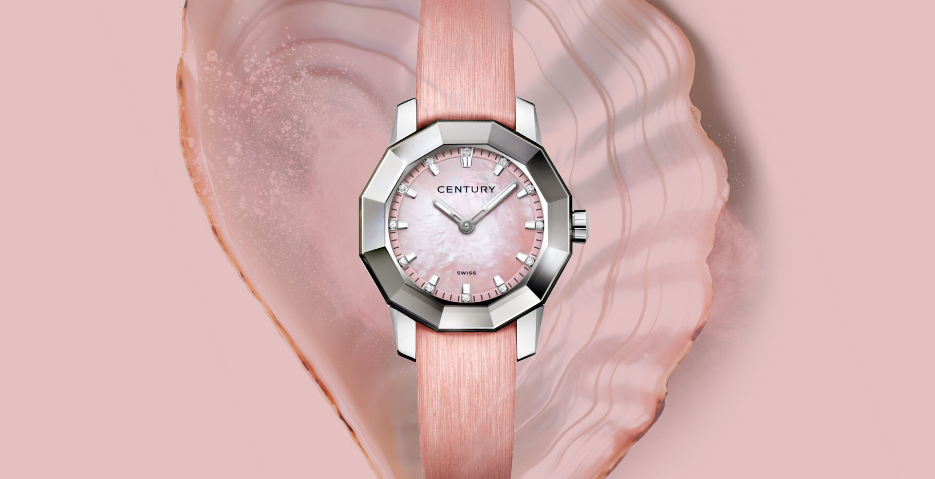 Model in stainless steel, CENTURY sapphire with 12 facets, MOP pink dial, Swiss quartz movement, pink irisated rubber strap. Water-resistant to 100 meters.